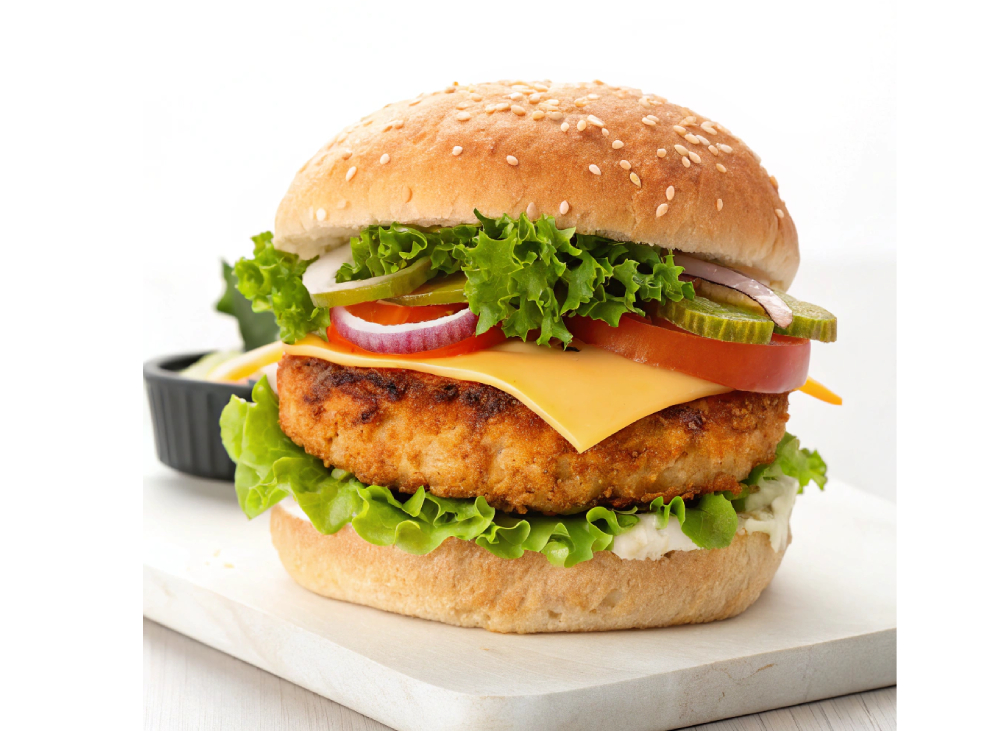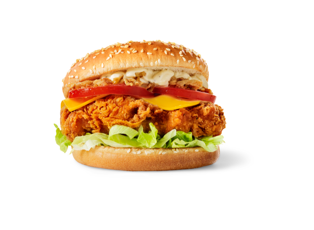 SLICED CHEESE, CHICKEN PATTY, FRESH SALAD WITH SPECIAL SAUCE AND MAYONNAISE