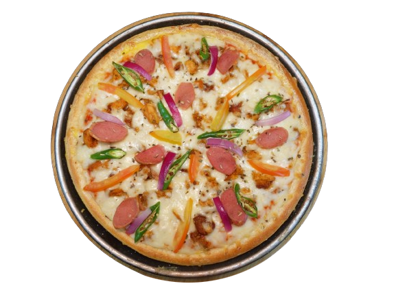 CHEESE, CHICKEN, SAUSAGES, BLACK OLIVE, CAPSICUM, ONION, ORIGANO, PIZZA SAUCE